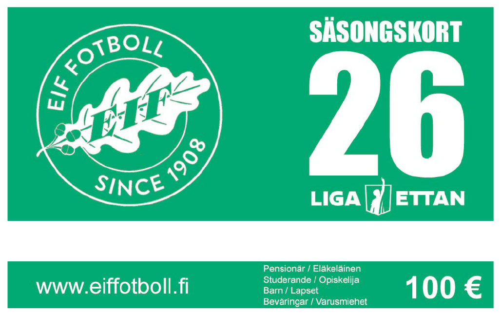 Fotboll är bäst LIVE! Genom att lösa in ditt personliga säsongkort har du inträdet fixat till EIF representationslags alla hemmamatcher under säsongen 2026. Detta säsongskort är ämnat för specialgrupper såsom pensionärer och studerande. Kom med och njut av stämningen på Centrumplan, och heja Grönvitt till seger!